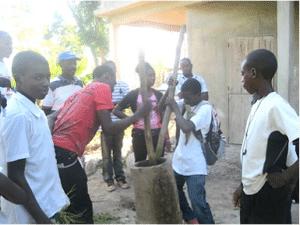 We traveled first by small plane from Cap Haitian to Lagonav Island. Then by motorcycle up the mountain to Matènwa, about an hour and a half ride. (Photo: Vince, me, and Chris on our flight to Lagonav Island.)