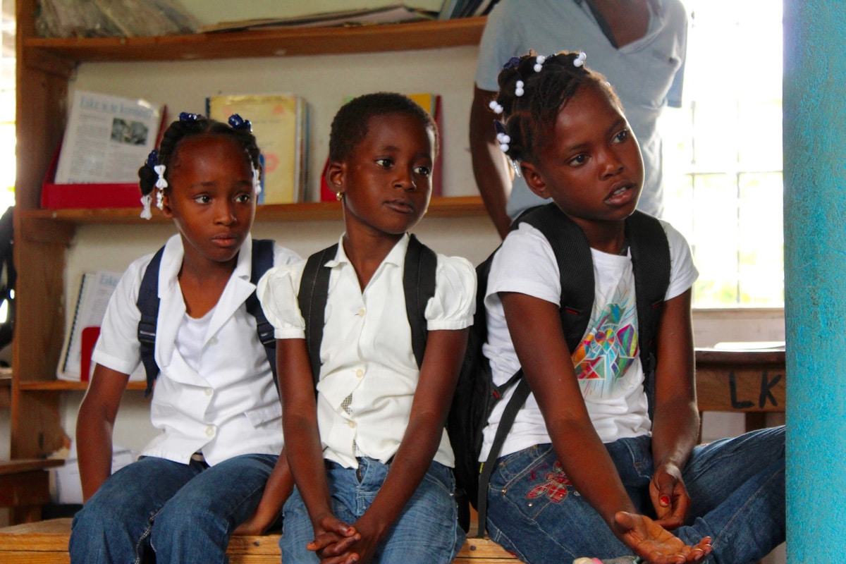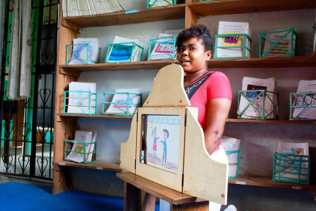 During my visit to the Matènwa Community Learning Center (MCLC), I observed Story Time with the 2nd graders! I had never seen anything like it. The students gathered around the carpeted area of the library by making themselves comfortable on benches and settled in for an exciting story. The librarian, Mirlanda Fleurant, sat against the bookshelves, facing her students, and set up the storytelling stage-like device originating from Japan, called a Kamishibai. The stage is a thin wooden box with side panels, and a slit where large story boards are inserted. Once everyone was seated, Ms. Fleurant began telling the story – pulling each numbered storyboard from the side, and sliding it at the back of the stack. After reading one board, Ms. Fleurant simply slid in out of the slot, and read the next. On the front of the boards were illustrations for the students to enjoy, and on the back of the previous storyboard was the corresponding passage, which Ms. Fleurant read aloud. It is a fascinating way to tell a story. Unlike a picture book, which is designed to be enjoyed by an individual, Kamishibai is a group activity – a shared experience that the students love!